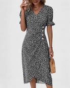 - Type: Wrap‑inspired midi dress with slip‑on back
