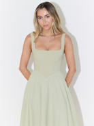 Velvet Noon is the kind of dress that makes every moment feel like a scene. With a fitted bodice that gently shapes your silhouette and a flared midi skirt that moves with ease, it blends classic femininity with modern simplicity. The square neckline and wide shoulder straps offer a clean, structured look that’s both comfortable and refined. Whether you're heading to a garden party, a romantic dinner or a stylish daytime event, this piece brings effortless elegance to the table.