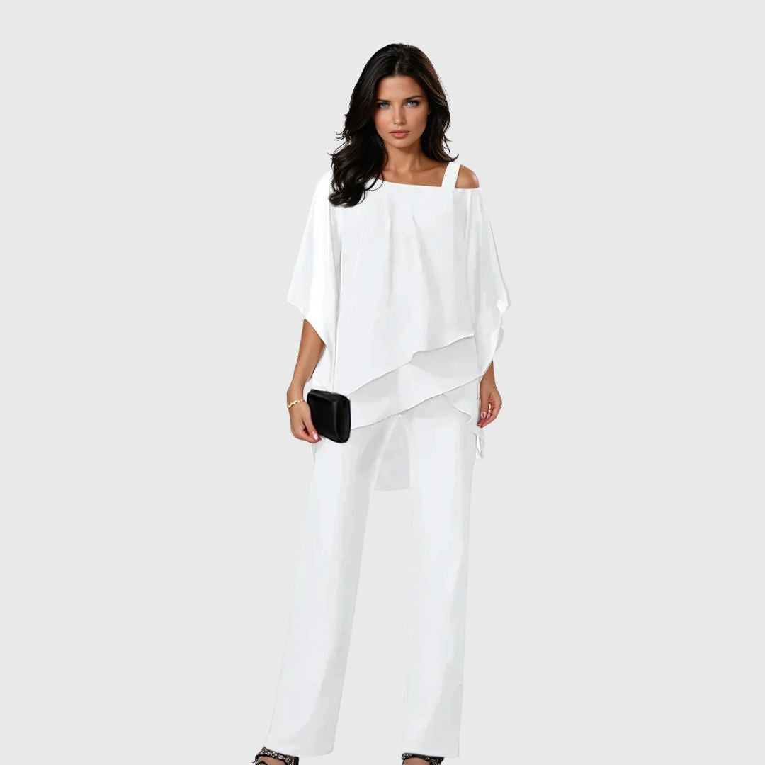 The Velurelle Two-Piece Set is your answer to effortless sophistication. With its asymmetrical layered top and wide-leg trousers, this ensemble blends breathable comfort with graceful movement. Whether you're attending a garden soirée or heading out for a stylish dinner, it transitions seamlessly from day to night with timeless flair.
